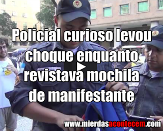 Observe que um dos PMs já estava com um morteiro na mão, ao pedir a mochila do rapaz para fazer uma revista, ele joga o morteiro no chão e o acusa de está carregando a bomba.